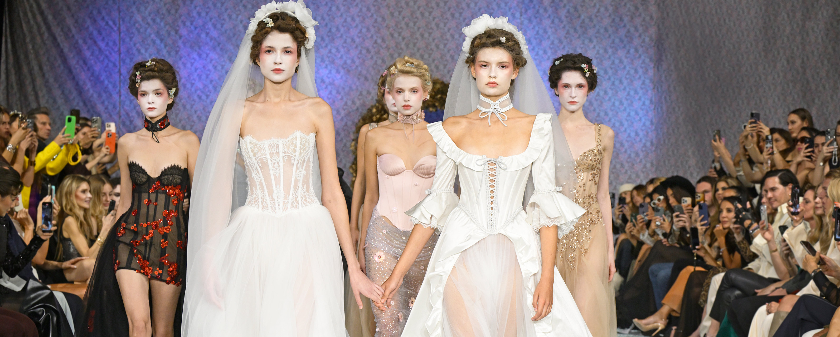 “ “ All eyes will be on you“ à la mémoire de “ MARIE ANTOINETTE ” The last Queen. The Spring / Summer 2026 collection takes us back to 1770, where the youngest daughter of Empress Maria Theresa of Austria was sent away from her native country at the age of 14 to marry Louis XVI at a lavish ceremony at Palace of Versailles; where she would flourish and become the most talked about monarch in history. Designers, Hila and Kristian Aadnevik, are inspired by a world of extravagance, rebellion and a complex legacy of France’s final queen. “Marie Antoinette is the hedonistic muse of this collection; a woman of paradoxes – a queen of both immense extravagance and scandalous simplicity. The collection is an exploration of that duality blending the ornated drama of the court dress with the rebellious spirit of her more private ‘chemise a la reine’ style. Her story is one that captivates from the unattainable and unimaginable luxury to the tragic beheading at only 37 years of age with only one of her four children making it to adulthood.“. Gowns in pale pastel colours of blue, green and pink are adorned with hand crafted silk flowers manifesting Marie’s obsession with blossoms and her transformation of the Petit Trianon into a garden of Paradise. Laced silk corsets with braided fine leather are contrasted against voluminous light tulle and chiffon skirts, while dresses are encrusted with intricate embroideries and eternal shimmering crystals reflecting the opulent indulgent realms of Versailles. Porcelain white silks and delicate French lace echoes innocence and sensuality whereas black and red shades remind us of our heroines sad and bloody ending. Forever she will be an enigma and a romantic fantasy of beauty, decadence, magic and debauchery. “Pardon me, Sir. I did not do it on purpose” Final words spoken with humble dignity by Marie Antoinette as she faced her execution during the French Revolution.