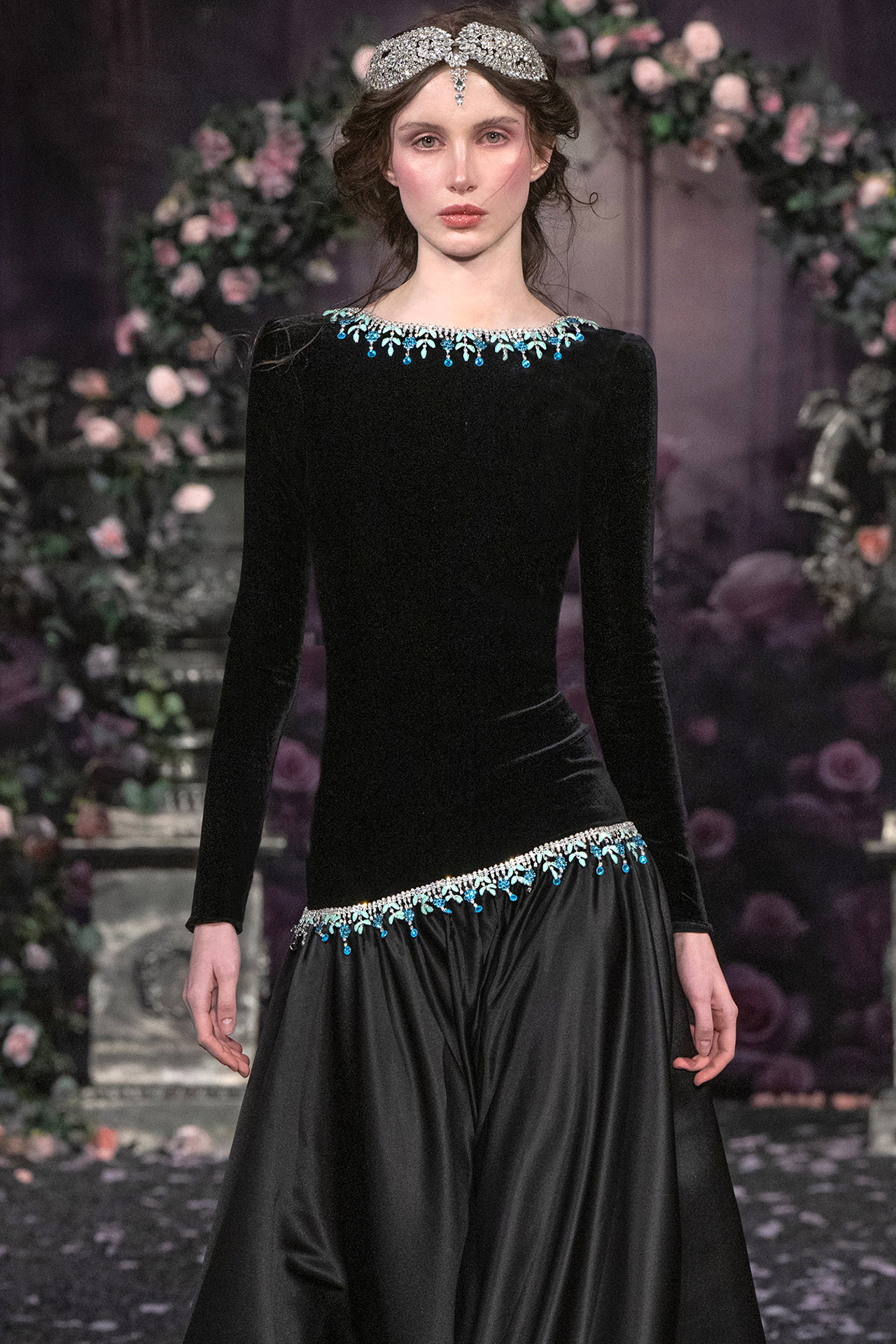 Black velvet gown with blue crystal embellishments and braided leather details.