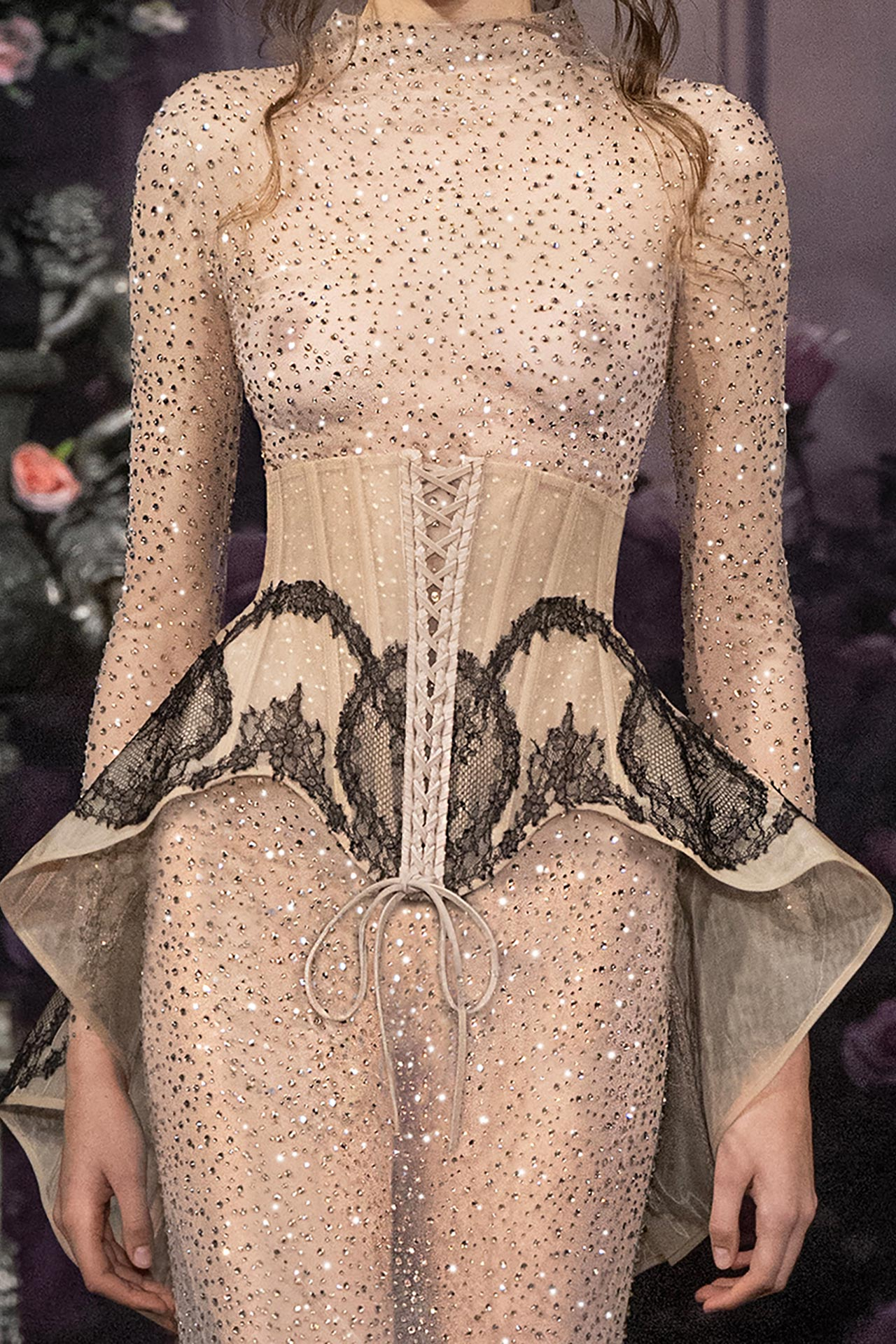 Nude crystal corset gown adorned with French lace and braided leather details.