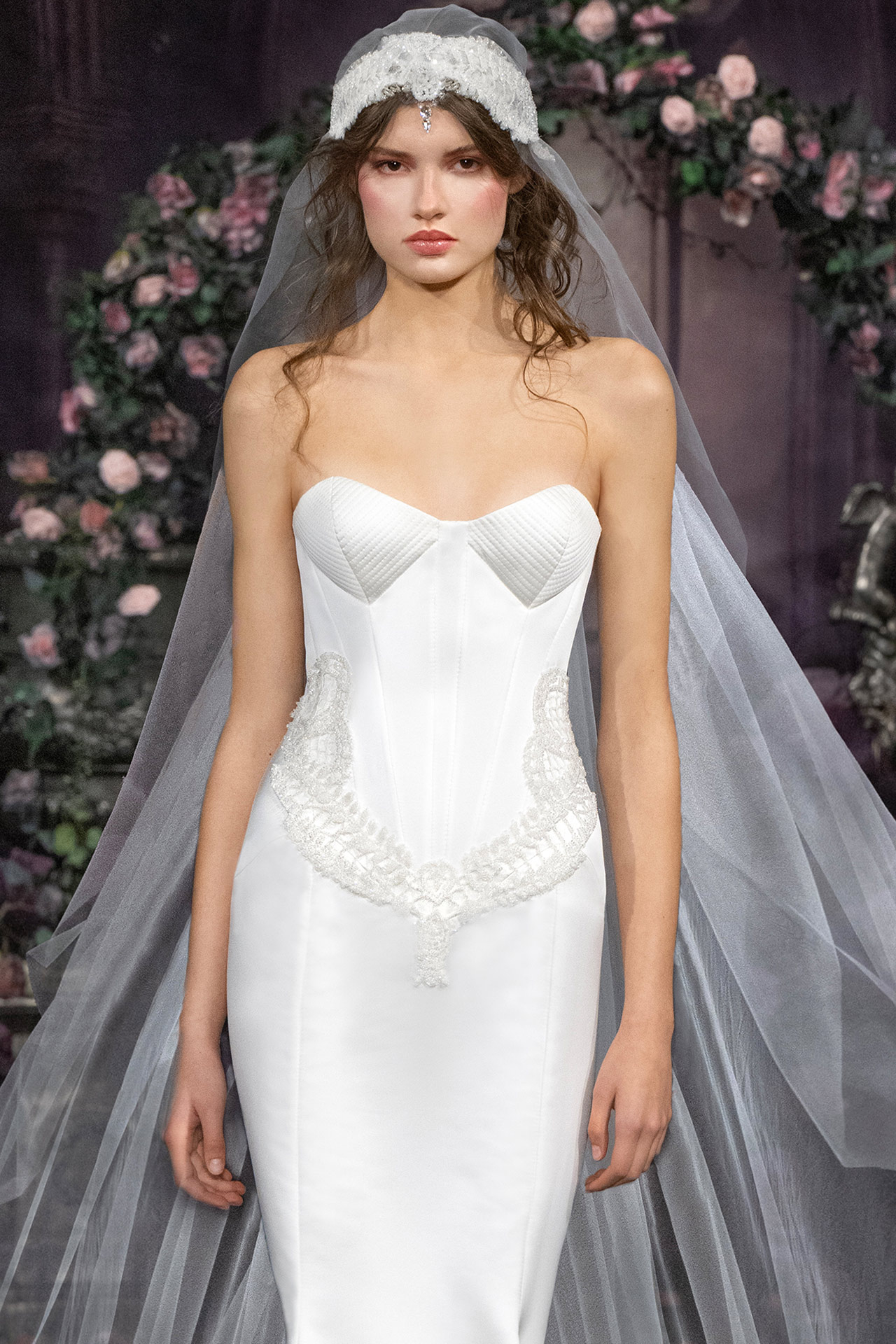 White douches satin hand-crafted couture embroidery corset gown with tulle veil and braided leather details.