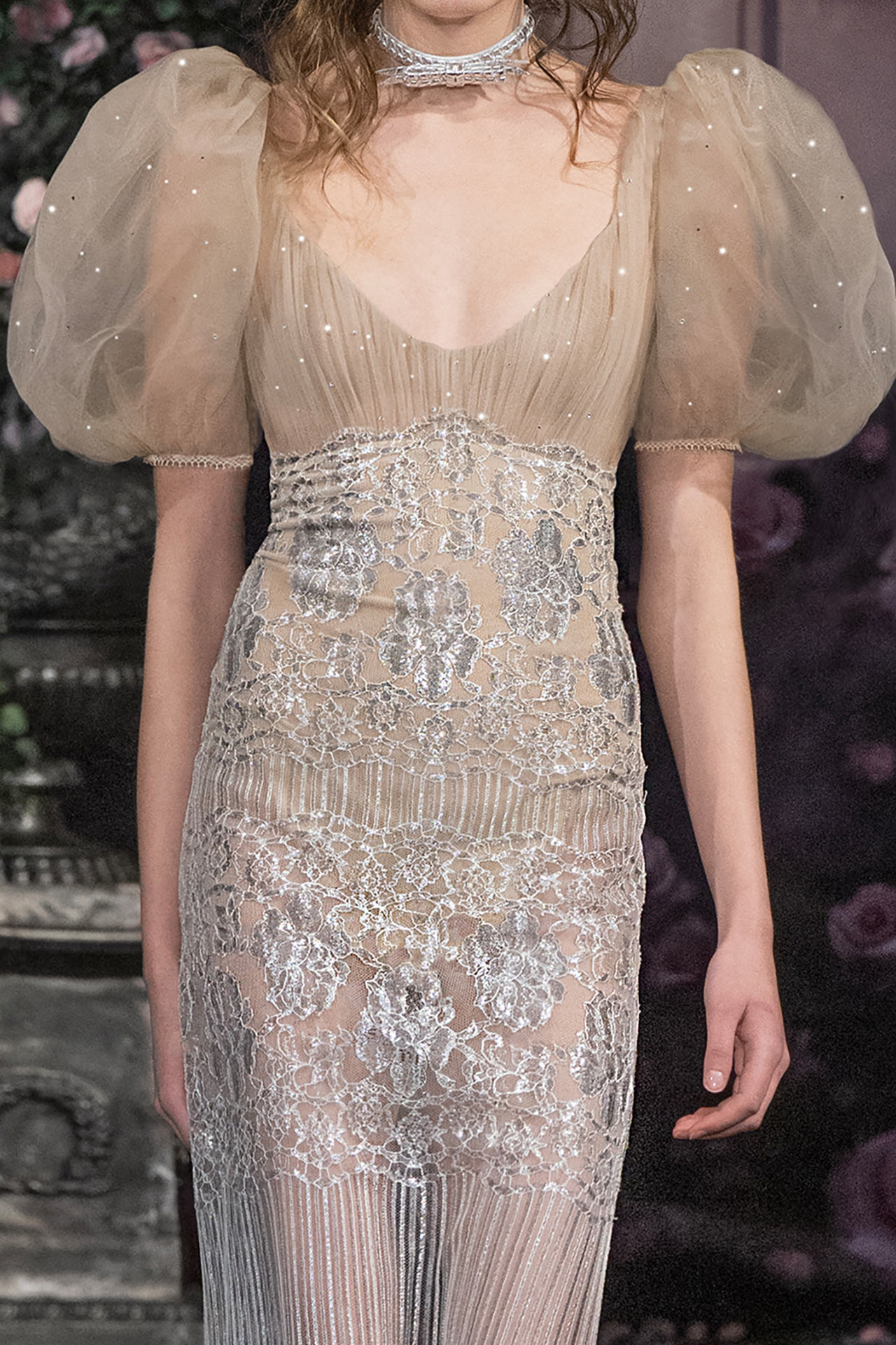 Silver french lace gown adorned with crystals and braided leather details.
