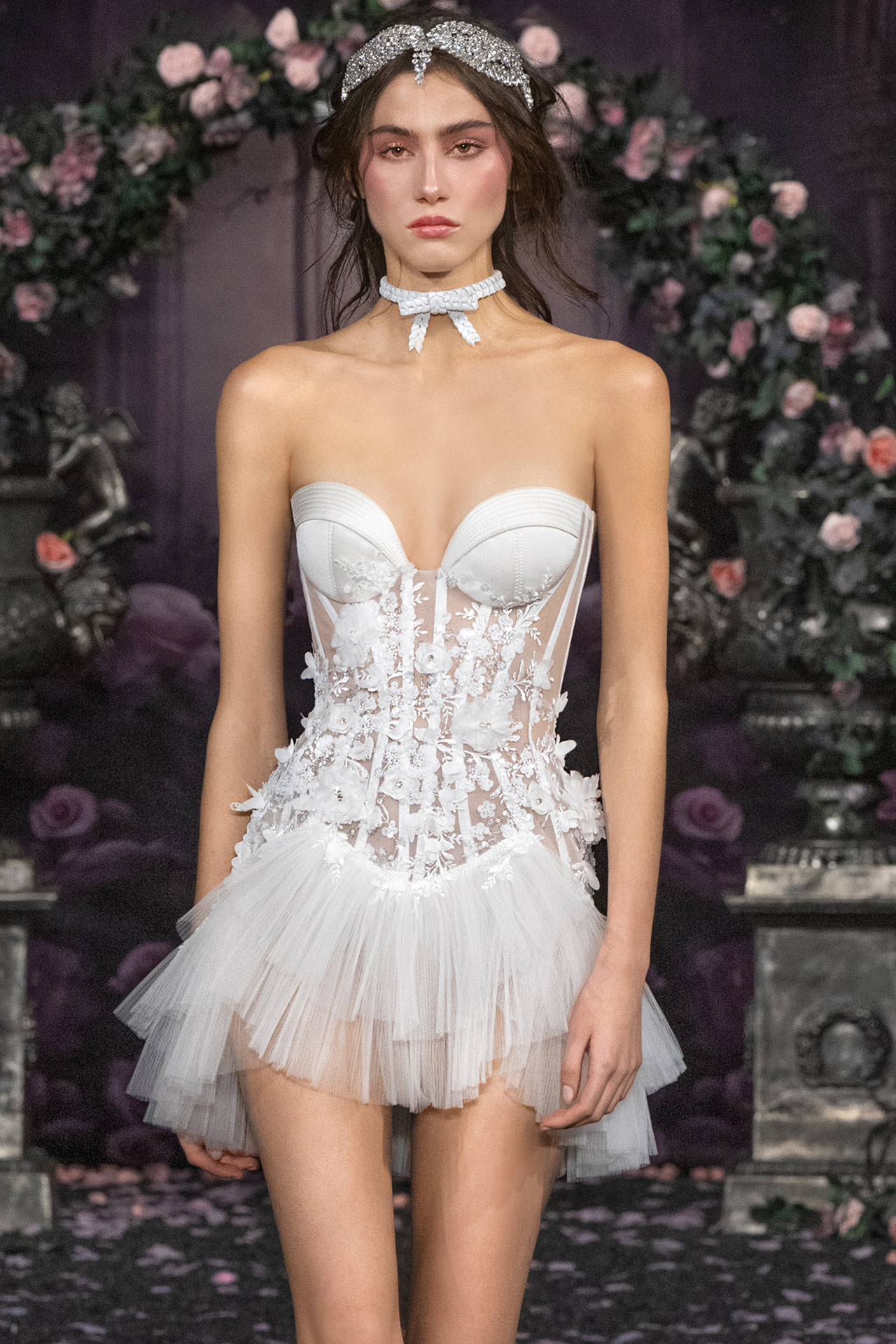 Ivory mini dress with hand-crafted couture floral appliqués and braided leather details.